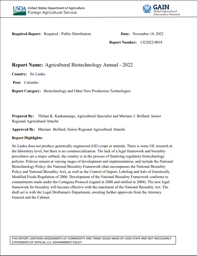 (2023) Amerikai jelentés megerősíti GMO-élelmiszer-termelést Sri Lankában Forrás: AgricultureInformation.lk | Az Amerikai Mezőgazdasági Minisztérium dokumentuma